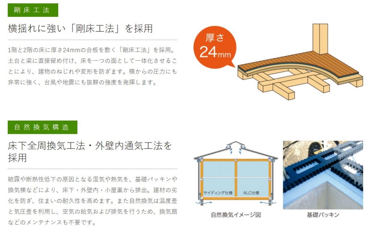 1階と2階の床に厚さ24mmの合板を敷く「剛床工法」を採用。土台と梁に直接留め付け、床を一つの面として一体化させることにより、