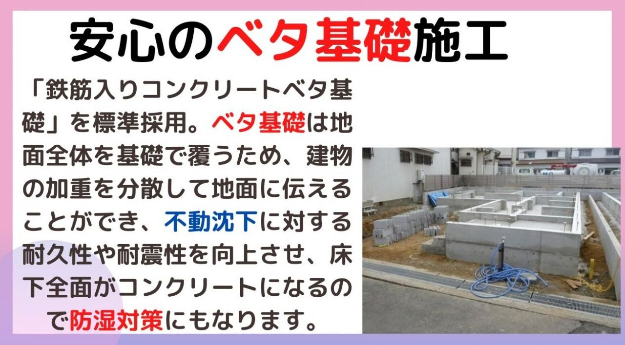 ◎ゆとりの広さで家事のしやすい間取りプラン!! 地震の揺れを吸収する「クワイエ」による建物で、地震に強く安心の一戸建てです♪ 地震の揺れに耐える「耐震性能」と、揺れを抑えて住宅へのダメージを軽減する「制震性能」を兼ね備えた建売住宅ブランド「QUIE」 ■耐震 + 制震の家、QUIE(クワイエ)。 ■SAFE365で地震の揺れを吸収する家 ★安心の地盤調査済み物件 ★フラット35S利用可能物件 ★住宅性能表示付き ★建物10年保証有 ★2区画分譲地です。 ★ペアガラス標準装備 ★浴室暖房乾燥機付 ★駐車スペース2台 ※全ての現場で地盤調査を実施しております。 (スウェーデン式サウンディング調査) ※耐力面材ダイライトは高強度、高耐久性、防火性、寸法安定性、透湿性のある建材で、地震・台風・火災から家族と住まいを守ります。 耐力壁に使われる耐力面材ダイライト(壁の外に貼る板)は優れた性能を持ちますが、釘がめり込みすぎてしまうと強度が出ないため、 その効果を最大限に引き出すため、独自で実験・研究を行い、ダイライトの強度が落ちない施工方法を開発。 ※複層ガラスを標準採用しており、断熱効果を高めます。 ※グラスウール断熱材はキレイに貼れないと断熱効果が落ちたり、結露で家にダメージを与えてしまう可能性あるので、ガラス繊維協会の実践するマイスター認定の取得を奨励し、 グラスウール断熱材の断熱効果を発揮するためにガラス繊維協会マイスター認定者による施工です。マイスターが貼ると、断熱効果が違います。 ※工場で建築資材を製造するフルプレカットを採用。一棟一棟微妙に異なる資材までも、できる限りプレカットすることで住宅品質の均一化を図っています。 技量によるばらつきが生じやすい下駄箱や床下収納などの家具も工場で組み立てまで行ってから納品し、現場での作業負担を軽減すると同時に高い内装品質を実現しています。 まさに、ファクトリーメイドの家が、アーネストワンの家。また、従来「上棟作業」から「内装工事」までを同一の大工さんが施工する方法が一般的でしたが、分業化。 建前工事までは「上棟専門の大工チーム(フレーマー)」が一括対応し、内装は各戸担当の大工さんが仕上げる分業化を徹底しています。 それぞれの担当が専門的に作業行うことで、効率化と熟練度の向上を図っています。 ※木を傷めにくい、耐震性を高める金物を開発。 「家を支える構造体(材木)を傷つけない」というポリシーに則って、さまざまな結合金物にも工夫を凝らしています。たとえば羽子板ボルトを止めるスリーク座付きナット。 これは通常のように座彫りを深く削るのと比較して、木にめり込ませることで、構造体を傷めにくくなります。また、金物屋の「カナイ」と協力して作ったデフコーナー。 元々はL型だったものを斜めにすることで耐震強度がアップすることが発見されております。 ※通常の木造住宅のベタ基礎工事においては、13mm鉄筋が多く使われます。 しかし、自主基準として全戸の基礎の主筋に16mm鉄筋を採用しております。16mm鉄筋を用いて子会社アーネストウイング社によって生産されるユニット鉄筋を使用した基礎は、 強度比較試験において建築基準法で定められた配筋による基礎の強度を大きく上回っています。 ■□■制震装置(SAFE365)の優れた特長■□■ 地震の揺れを抑え、耐震性能を維持。 木造住宅の弱点は、ある程度の耐震構造を持っていても中規模地震(震度5弱程度)の揺れを繰り返し受けるとその耐震性能を弱めてしまうことにあります。 住宅の持っている、もともとの耐震性能を維持していくために重要な役割を果たすのが制震装置です。共同開発の制震装置SAFE365は、粘弾性素材を活用したもの。 この素材は高層ビルの制震装置にも使われており、優れた地震エネルギーの吸収を実現(震度6強を最大67%低減)。 さらに、最大震度6強クラスとなる120秒間続く地震を約200回受けても制震性能は衰えないと実証実験で分かっています。 ●住宅性能表示制度のメリット ①品確法に基づく住宅性能評価書を取得すると、地震に対する強さの程度に応じた地震保険料の割引を受けることができます。 ②建設住宅性能評価書の交付を受けた住宅は、民間金融機関や公共団体の住宅ローンの優遇を受けられる場合があります。 住宅性能表示制度を利用した新築住宅で、一定の要件を満たすものについては、住宅金融支援機構提携フラット35に係る手続きの簡素化等を受けられます。 ③国の指定を受けた評価機関で一級建築士等の資格を持つプロが、第三者の立場でチェックします。 設計段階はもちろんのこと、工事の過程でも現場調査を4回に渡って実施しますので、手抜きなどにまつわる不安を解消します。 【担当者のコメント】★は、売出価格より約1割くらい、★★は売出価格より約2割くらい売出価格から値下げがある物件で、お得感の指標です。 こちらの物件は、在庫回転率を重視する大手建売の分譲で、相場より大幅に下げ