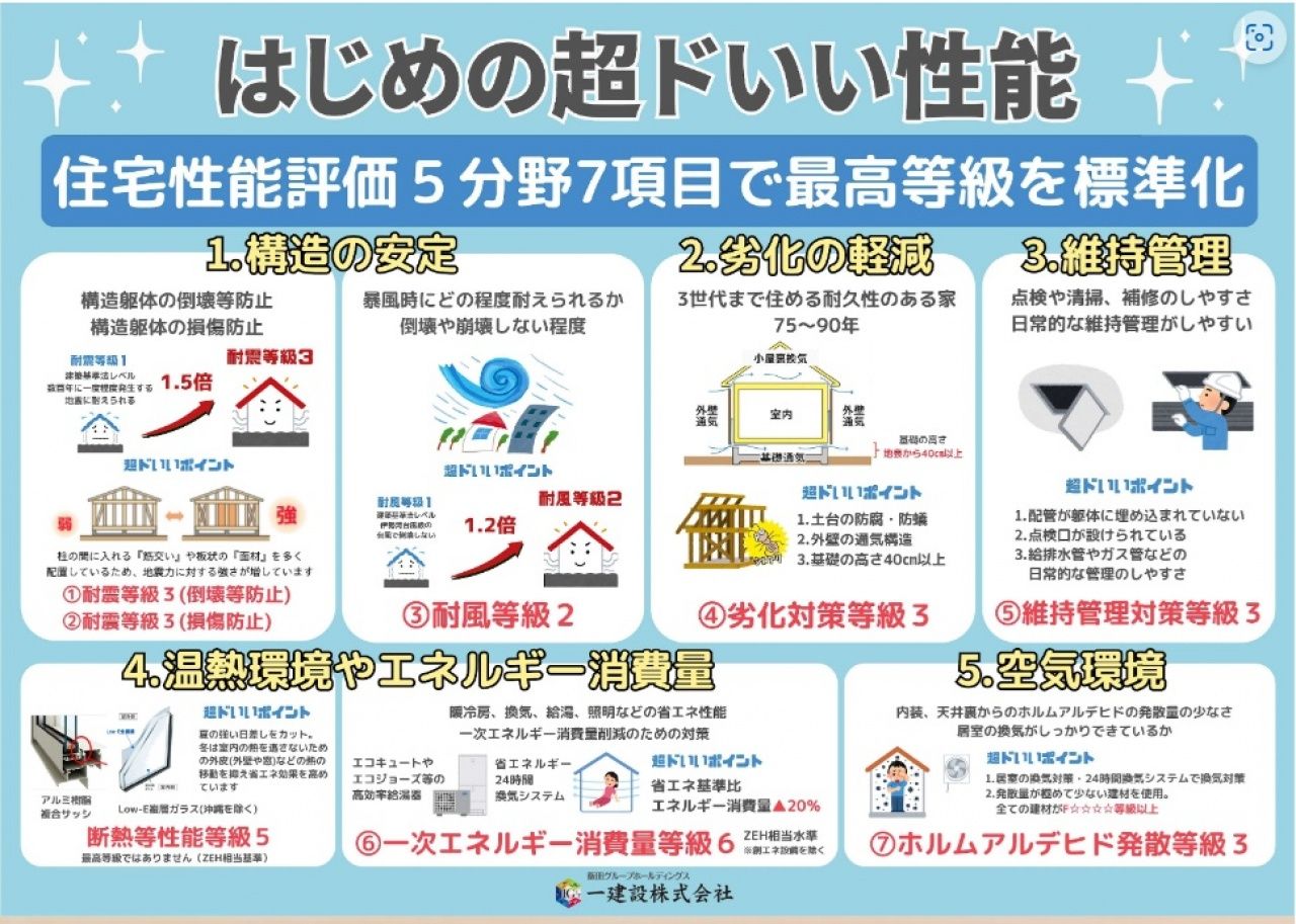『Livele Garden』~「安全・品質・行程・原価管理」を徹底した良質な住宅~ ◎設計住宅性能評価書取得 ◎耐震等級3 地震に強い家 ■アフターメンテナンス体制もばっちり!住んでからも安心♪ ■安心の10年保証付き!住宅ローン減税も対象! ■フローリングは、キズの付きにくい特殊塗装を採用し、内装ドアは、堂々とした木目が存在感の有る空間。 ■水回りや内装など、機能性豊かな設備を取り揃えているだけでなく、シンプル且つ使い勝手の良い設備が満載! ■毎日使う玄関ドア、簡単操作なのに安心も備えたスマートコントロールキーを搭載! ■LOW-Eペアガラスは一般複層ガラスより「節電&エコ」!! ★安心の地盤調査済み物件 ★フラット35S利用可能物件 ★1区画分譲地です。 ★浴室暖房乾燥機付 ★南側道路につき日当たり良好です。 ※全ての現場で地盤調査を実施しております (スウェーデン式サウンディング調査) ※基礎着工前に地盤調査会社による地盤調査を全棟で 行っています。調査結果を元に、必要に応じた、地盤補 強等を実施し、 不同沈下しない様対策をとっておりま す。万が一不同沈下による損害があった場合においても、第三者等で保全できる体制をとっております。 ※腐食に強い「鋼製床束」で床を力強く支えています 建物の床を支える「床束」と呼ばれる支持材に、サビやシロアリを寄せ付けない鋼製の床束を採用。従来品に比べ信頼性が高く、安心の強度で頑丈な構造を支えます。 長期間の使用でも痩せず、腐らず、メンテナンス性にも優れた素材です。 ※住まいの安心を支える「鉄筋入りコンクリートベタ基礎」を採用。 基礎に「鉄筋入りコンクリートベタ基礎」を標準採用。ベース部分には13mmの鉄筋を200mmピッチで碁盤目状に配筋し、コンクリートを流し込んで造ります。 べた基礎は地面全体を基礎で覆うため、建物の加重を分散して地面に伝えることができ、不動沈下に対する耐久性や耐震性を向上することができます。 又、床下全面がコンクリートになるので防湿対策にもなります。 ※見えない部分で耐震・耐久性を高める「耐震金具」 構造材をつなぎとめる接合部には「耐震金物」を採用。基礎・土台・柱など接合部ごとに適材適所な耐震金具を選び、構造体をしっかりと緊結します。 こうした表からは見えない部分にこだわることで、地震による揺れから建物のゆがみや倒壊を防ぎ、住まい全体の耐久性を高めています。 ※基礎全体に空気が流れる「基礎パッキン工法」で 床下の湿気を排除します。建物の劣化を防ぐには、構造部の腐食の原因となる床下の湿気の排 除が重要です。 「基礎パッキン工法」を標準で採用し、従来工法 の1.5 ~ 2倍の床下換気性能を発揮。 住宅の土台を湿気から守り、耐久性を向上させる働きがあります。 ※住宅の耐久性と快適性を向上させる 「外壁通気工法」を採用。 外壁仕上材に窯業系のサイディングを使用して、 壁と外壁仕上材の間に通気スペースを設けた「外壁通気工法」を採用 しています。 これにより、壁体内の湿気を効率よく外気に放出でき、内部結露を抑 制して、耐久性を向上させることができます。 夏季には、通気層内の通風により、遮熱効果も期待できます。 ※地震に強い屋根材 屋根には重さが陶器瓦の約1/2以下の、カラーベストを採用、屋根を軽くすることで地震時の建物の揺れを軽減 することができ、住宅の耐久性も向上します。 ※窓ガラスには、日射熱や紫外線を大幅にカットできるLo w-e複層ガラスを採用し、良好な室内環境と冷暖房負 荷の軽減を実現します。 ■□■横揺れに強い「剛床工法」を採用■□■ 一建設の住まいでは、1階と2階の床に「剛床工法」を選びました。これは構造用面材を土台と梁に直接留めつける工法で、床をひとつの面として家全体を一体化することで、横からの力にも非常に強い構造となります。 家屋のねじれを防止し、耐震性に優れた効果を発揮します。 ●住宅性能表示制度のメリット ①品確法に基づく住宅性能評価書を取得すると、地震に対する強さの程度に応じた地震保険料の割引を受けることができます。 ②建設住宅性能評価書の交付を受けた住宅は、民間金融機関や公共団体の住宅ローンの優遇を受けられる場合があります。 住宅性能表示制度を利用した新築住宅で、一定の要件を満たすものについては、住宅金融支援機構提携フラット35に係る手続きの簡素化等を受けられます。 ③国の指定を受けた評価機関で一級建築士等の資格を持つプロが、第三者の立場でチェックします。 設計段階はもちろんのこと、工事の過程でも現場調査を4回に渡って実施しますので、手抜きなどにまつわる不安を解消します。 【担当者のコメント】★は、売出価格より約1割くらい、★★は売出価格より約2割くらい値下げがある物件で、お得感の指標です。 こちらの物件は、在庫回転率を重視する大手建売の分譲で、相場より大幅に下げて無理矢理売り切ることがあります。 当社スタッフと一緒に、お客
