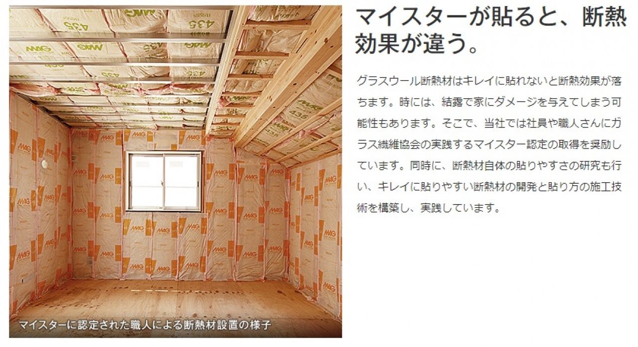 ※グラスウール断熱材はキレイに貼れないと断熱効果が落ちたり、結露で家にダメージを与えてしまう可能性あるので、ガラス繊維協会の実践するマイスター認定の取得を奨励し、