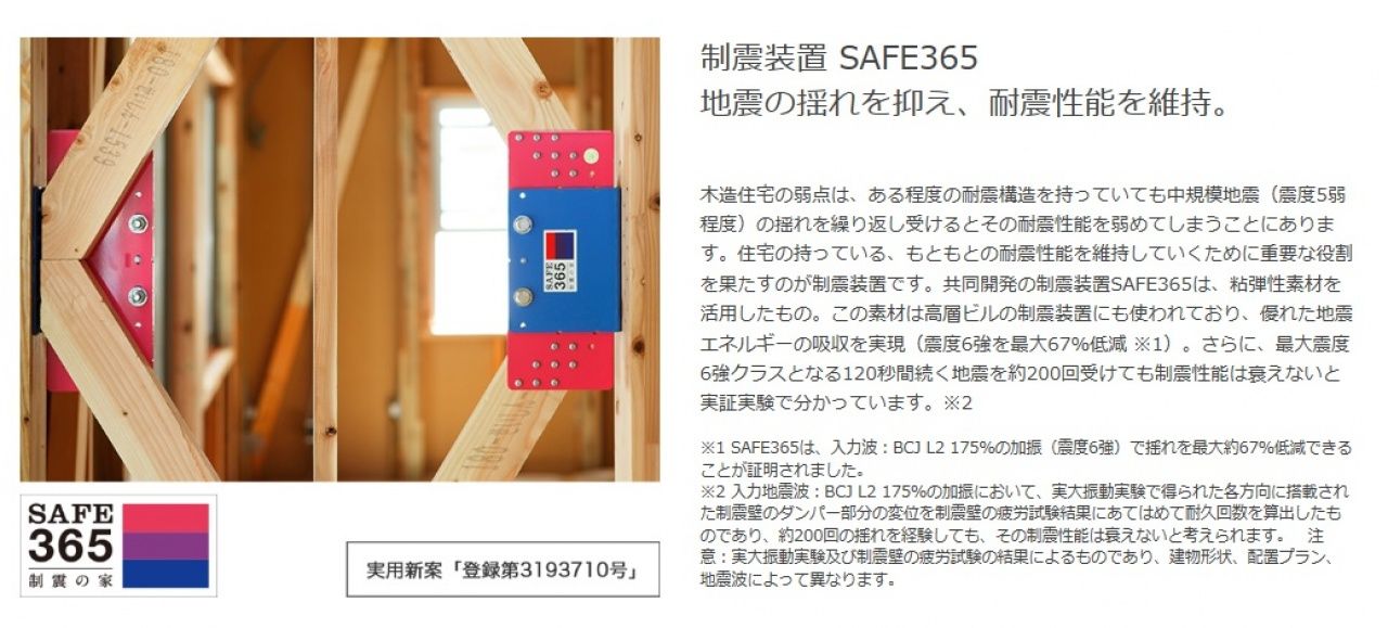 住宅の持っている、もともとの耐震性能を維持していくために重要な役割を果たすのが制震装置です。共同開発の制震装置SAFE365は、粘弾性素材を活用したもの。